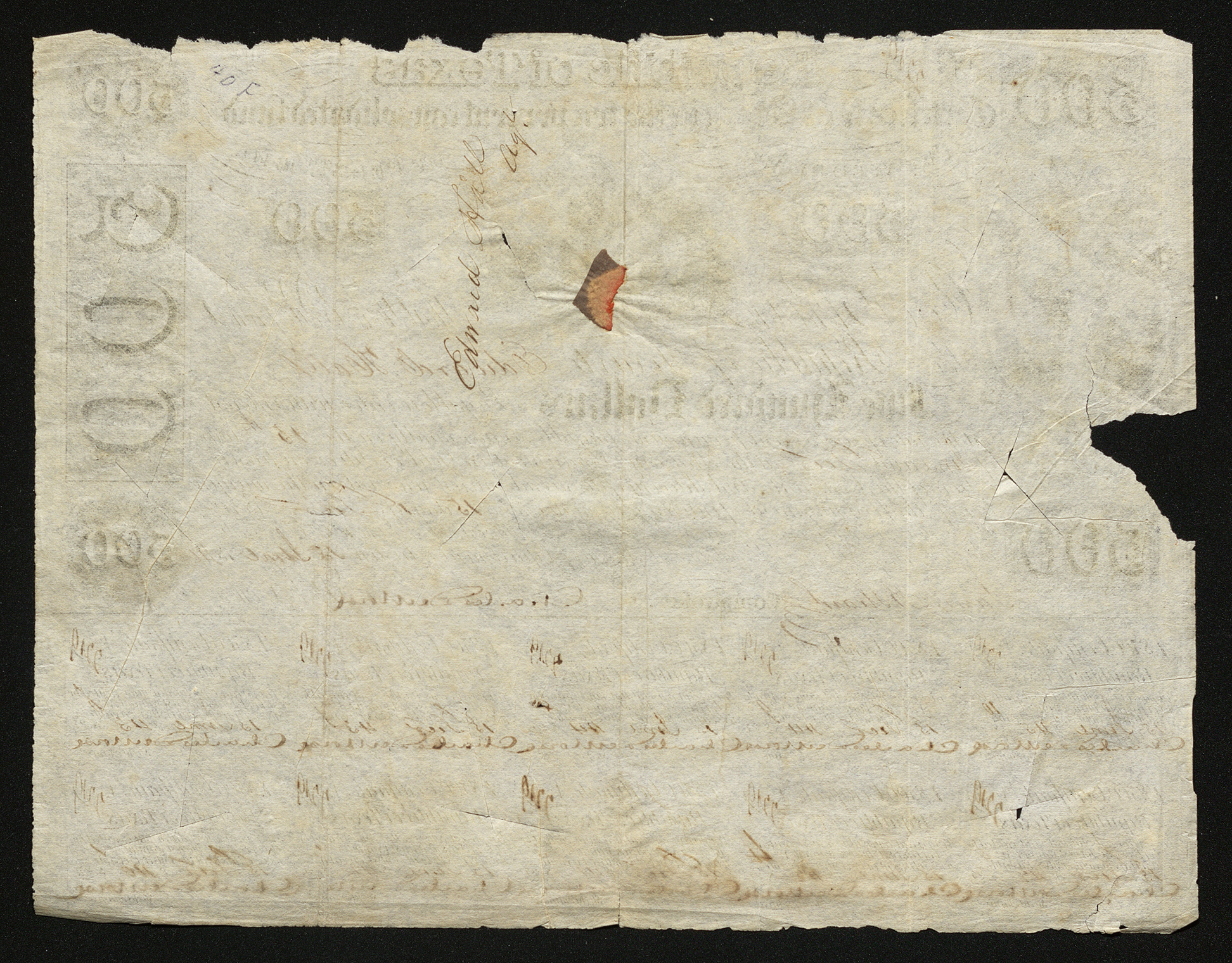 The Republic of Texas stock certificate reads: No. 2119 Republic of Texas Certificate of Stock in the ten per cent consolidated fund. Created by Act of Feb. 5th 1840 Be it known that there is due from the Republic of Texas Edward Hill Five Hundred Dollars Payable to order, with interest at the rate of ten per cent per annum, payable semi-annually on the 15th days of June and Decr. at the Treasury Department, in Gold or Silver, on presentation of this Certificate and delivery of the several interest warrants on the margin hereof, the first payment of interest to be made on the 15th days of Decr 1840. The principal redeemable at the pleasure of the Government after the 30th day of June 1845. This certificate to be transferable by simple endorsement Treasury Department. Austin 15 June 1840 Signed Comptroller by James B. Shaw Signed Stock Comm. by Charles DeMorse The aforementioned interest warrants read: A. $500 Certificate. No. 2219 Republic of Texas Ten per cent consolidated fund created by Act of Feb. 5th 1840 Interest warrant No (1 - 10 depending on the warrant) for $25 in Gold or Silver Payable— In numerical order warrant 1 - 10 15 Decr 1840 15 June 1841 15 Decr 1841 15 June 1842 15 Decr 1842 15 June 1843 15 Decr 1843 15 June 1844 15 Decr 1844 15 June 1845 All signed by Stock Commiss Charles DeMorse The back of this is signed by Edward Hill and has no other information.