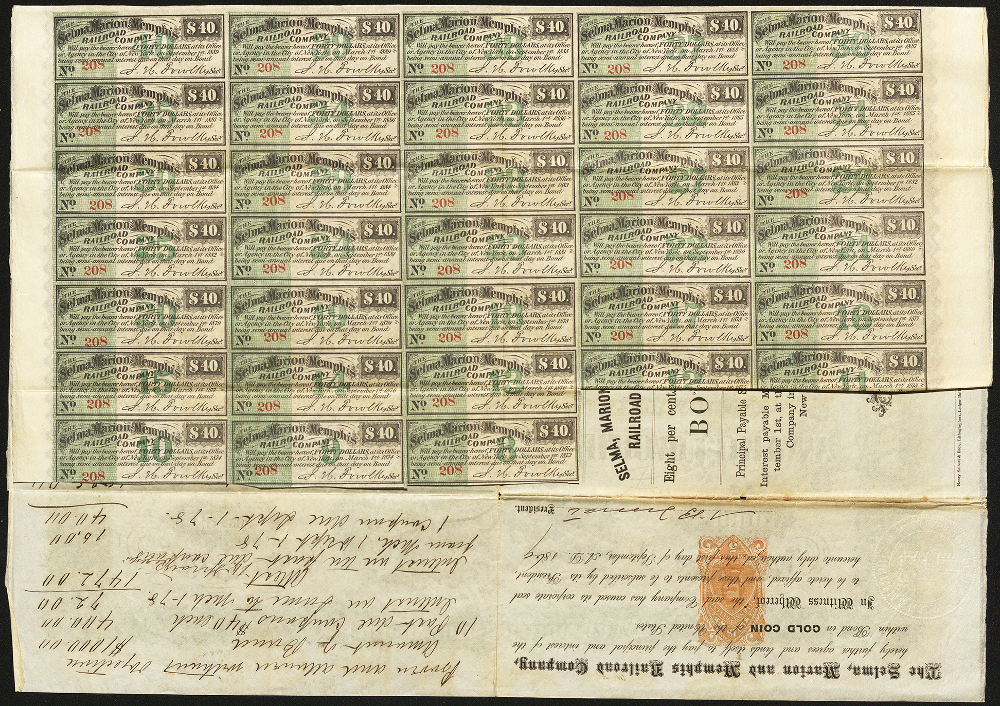 The Selma, Marion and Memphis Railroad Company stock certificate reads: State of Alabama No 208 | $1000 Selma, Marion and Memphis Railroad Company First Mortgage Eight Per Cent. Bond Endorsed by the State of Alabama Know all men by these presents, that the Selma, Marion and Memphis Railroad Company, a Corporation existing under the Laws of the State of Alabama, acknowledges itself to be indebted to the holder hereof, in the sum of One Thousand Dollars, which sum the said Company hereby promises to pay to the holder hereof, on the First day of September in the year One thousand, eight hundred and eighty nine, at the office or Agency of said Company in the City of New York, with interest thereon, at the rate of Eight per cent. Per annum, payable semi-annually, at the said Office or Agency in the City of New York, on the first days of March and September in each year, on the presentation and surrender of the annexed Coupons as they severally become due. This is one of a series of Bonds of the same tenor date and amount, numbered consecutively from one upwards, and limited to $16,000 per mile of completed railroad, in the State of Alabama issued under the provisions of an Act of the General Assembly of Alabama entitled An Act to establish a system of Internal Improvements in the State of Alabama, approved February 19th 1867 and An Act amendatory thereof, approved September 22nd 1868; all secured by the first and exclusive lieu provided for in said Acts, on the raid road of said Company and its equipments and all other property including the franchise of the Company, with power of sale in case of default’ and by endorsement of the State of Alabama, made under authority and in pursuance of the Acts of the General Assembly aforesaid. In Witness Whereof, the said Company has caused its Corporate Seal to be hereto affixed and these presents to be signed by itse President and Secretary, on the first day of September, A.D. 1869. Signed by the Secretary A. M. Fowlkes Signed by the President N. B. Forrest The 33 coupons below each state: The Selma, Marion and Memphis Railroad Company will pay the bearer hereof, Forty Dollars, at its Office or Agency in the City of New York, on September/March 1st 1873 - 1889 being semi-annual interest due on that day on Bond. No 208 Signed by the Secretary A. M. Fowlkes The back of this document has four different bodies of text, from top to bottom, they read The Selma, Marion and Memphis Railroad Company, hereby further agrees and binds itself to pay the principal and interest of the within Bond in Gold Coin of the United States. In Witness Whereof, the said “Company has caused its corporate seal to be hereto affixed, and these presents to be subscribed by its President hereunto duly authorized, this first day of September, A.D. 1869. Signed by the President N. B. Forrest Proven and allowed within objective Amount of Bank 10 Pack due coupons $40 each Interest due June to March 1-78 Interest due the first due coupons (illegible correction written above this line) From March, 1 Sept. 1 - 78 1 coupon due Sept 1 - 78. $1000.00 + 400.00 + 72.00 = 1472.00 + 16.00 + 40.00 = 1528.00 illegible Guaranteed by the State of Alabama | No. 208 $1000. | Selma, Memphis and Marion Railroad Company. | Eight Per Cent. First Mortgage Bond | Payable September 1st, 1889 | Interest payable March 1st, and September 1st, at the Agency of the Company in the CIty of New York Henry Seibert & Bros., Lithographers, Ledger Building, corner William and Spruce Streets, N.Y. Endorsement by the State of Alabama. In Pursuance, and under authority of an Act of the General Assembly of the State of Alabama, entitled, “ An Act to establish a system of internal improvements in the state of Alabama,” approved, February 19th 1867; and an Act of said Assembly, amendatory thereof, approved September 22nd, 1868, the State of Alabama, acting by its Governor, hereby endorses the within Bond of the Selma, Marion and Memphis Railroad Company, and thereby binds itself for the payment of the principal interest of this Bond, according to the terms and provisions of the Acts aforesaid; the said Railroad Company having complied with the conditions which authorize and require the Governor to make this endorsement on behalf of said State. In Witness Whereof, the said Governor has hereunto subscribed his name and caused the seal of said state to be hereto affixed, this 1st day of September A.D. 1869 Signed by the Governor W. H. Smith