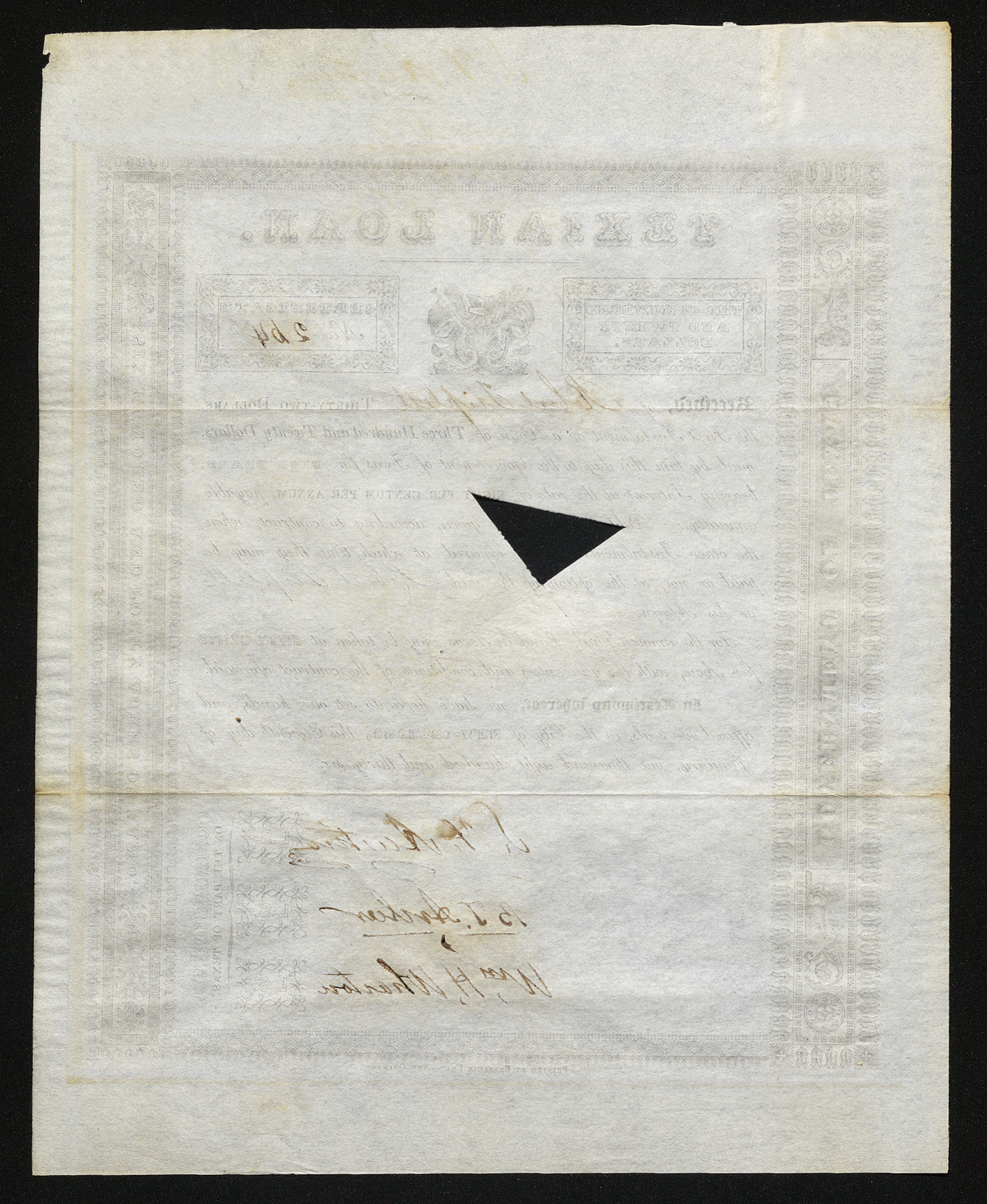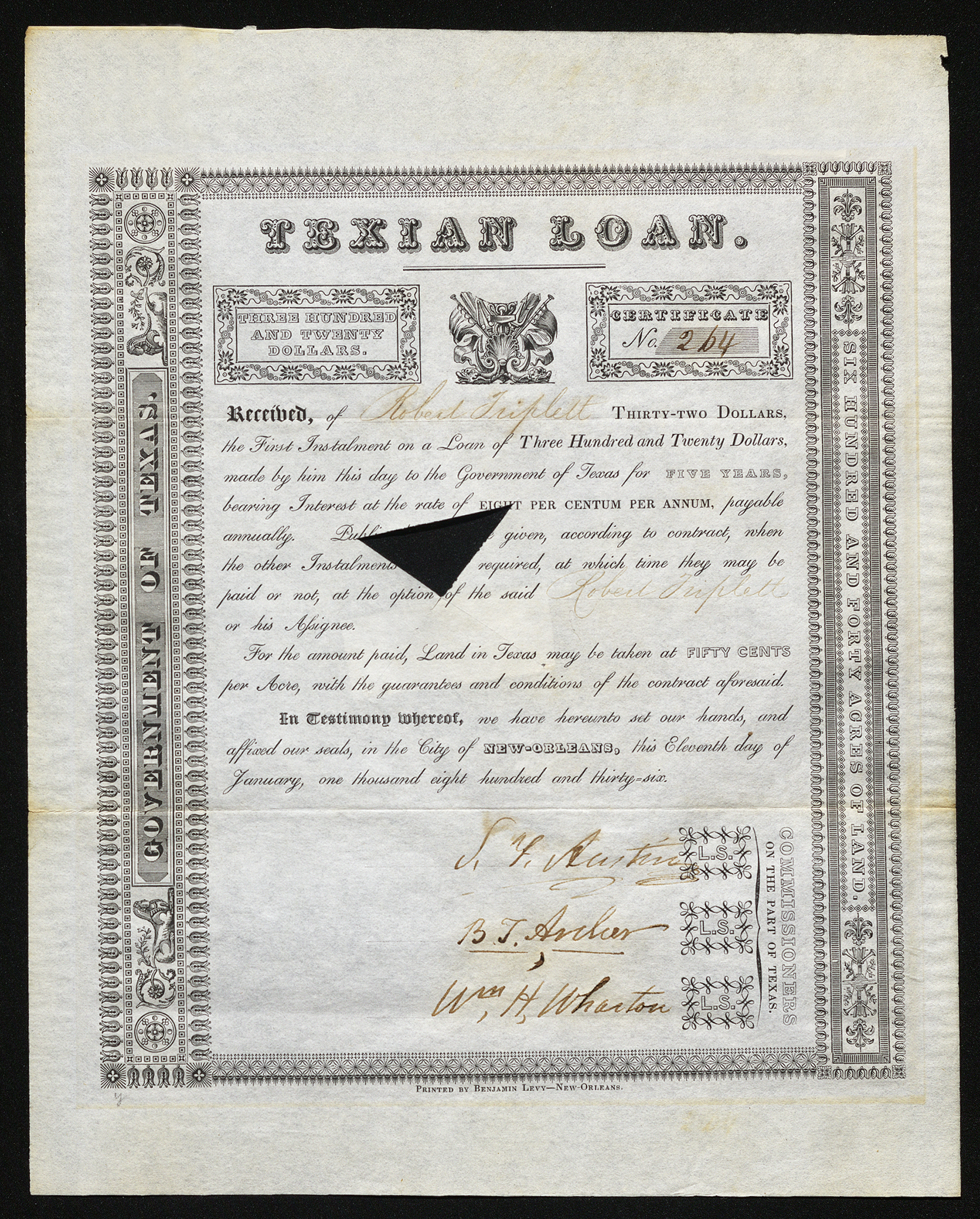 Received, of Robert Triplett Thirty-Two Dollars, the First Installment on a Loan of Three Hundred and Twenty Dollars, made by him this day to the Government of Texas for five years, bearing Interest at the rate of eight per centum per annum, payable annually. L— given, according to contract, when the other Installments — required, at which time they may paid or not, at the option of the said Robert Triplett or his assignee.