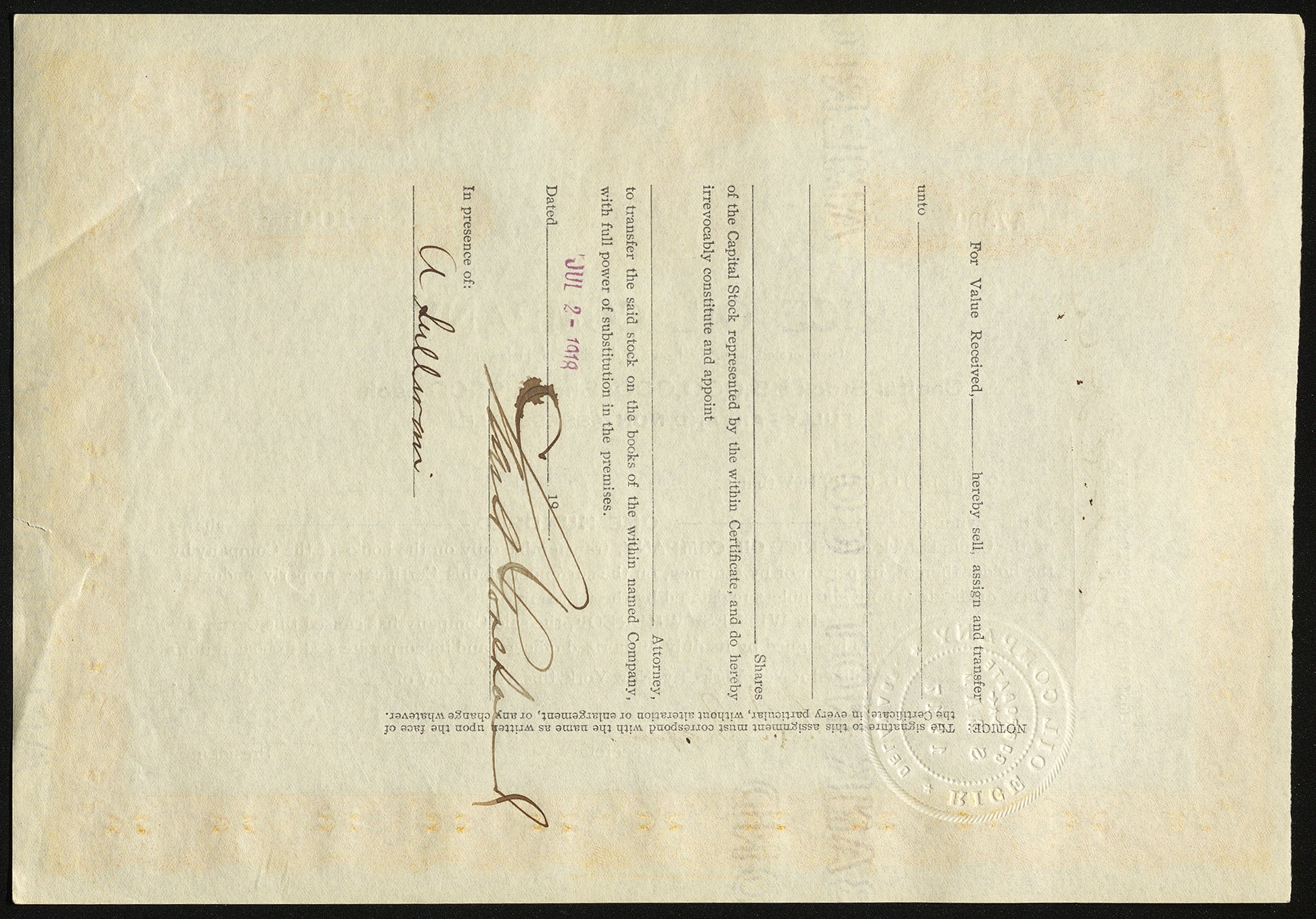 The Rice Oil Company stock certificate reads: Number A7339 | 100 Shares Rice Oil Company Incorporated under the Laws of the State of Delaware Capital Stock $5,000,000; Shares $1.00 each. Fully Paid and Non-Assessable Registered by the Registrar and Transfer Company Jul 1 1918 by the Registrar and Secretary (illegible) This is to Certify that Chas. A. Stoneham & Co. is the owner of One Hundred shares of the Capital Stock of the Rice Oil Company, transferable only on the books of the Company by the holder thereof, in person or by attorney, on the surrender of this Certificate, properly endorsed. This Certificate is not valid unless registered by the registrar. In Witness Whereof, the said Company has caused this Certificate to be signed by its duly authorized officer, and its corporate seal to be hereunto affixed at New York City, New York, this 2 day of Jun A.D., 1918 Signed by the Asst. Secretary J. R. Biggam Signed by the Vice President G. G. Rice The back of this stock certificate states: For Value Received, _____ hereby sell, assign and transfer unto _________ Shares of the Capital Stock represented by the within Certificate, and do hereby irrevocably constitute and appoint ________ Attorney, to transfer the said stock on the books of the within named Company, with full power of substitution in the premises. Dated Jul. 2 - 1918 Signed by (illegible) In Presence of A. Fullerman Notice: The signature to this assignment must correspond with the name as written upon the face of the Certificate, in every particular, without alteration or enlargement, or any change whatever.