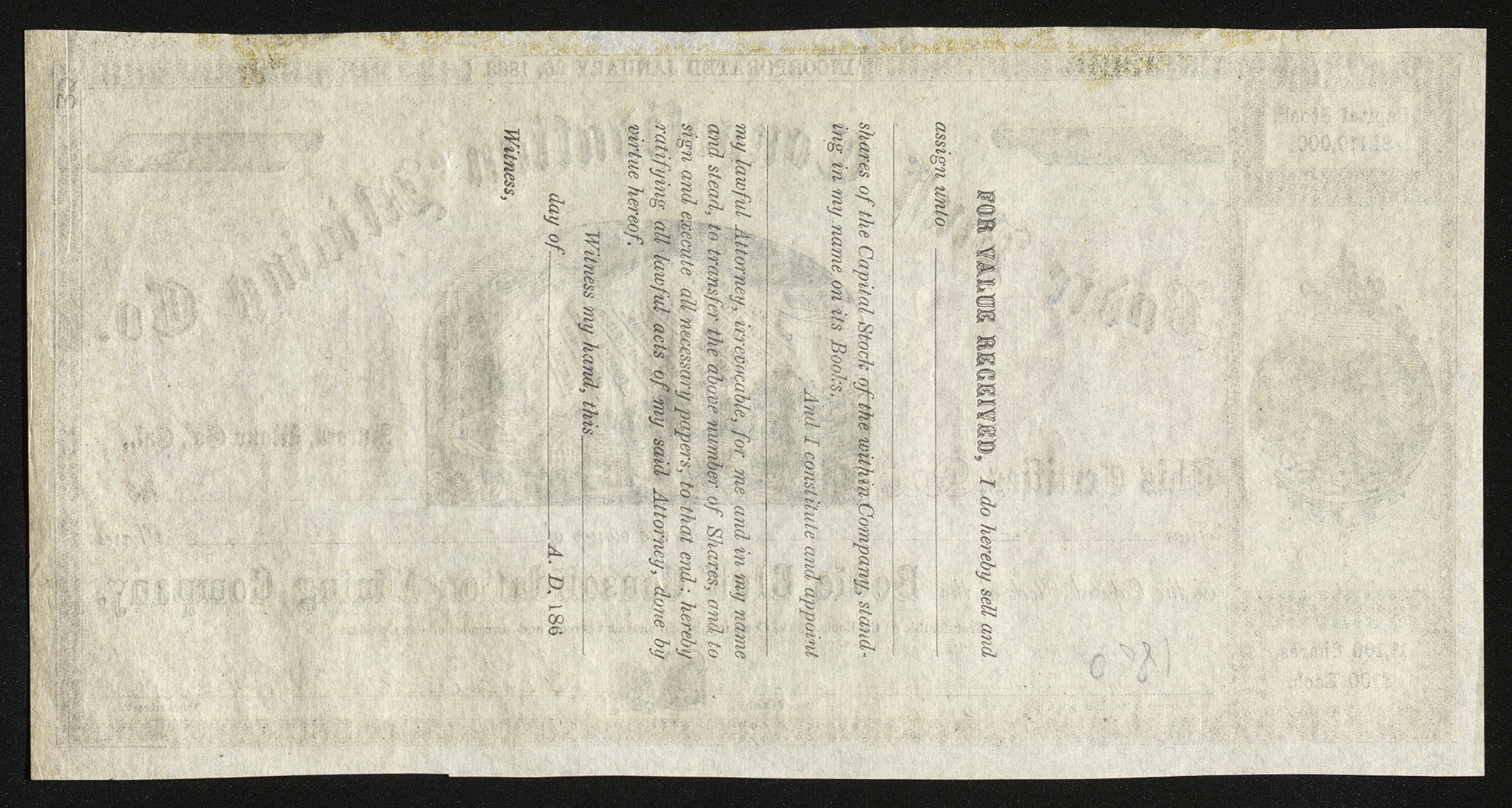 The Bodie Bluff Consolidation Mining Company stock certificate reads: Incorporated January 26, 1863 Capital Stock, $1,110,000. 11,000 Shares $100 Each. No. ____ | ____ Shares Bodie Bluff Consolidation Mining Co. Aurora, Mono Co., Cal., ____186_ This Certifies, that ______is the owner of ____ Shares in the Capital Stock of the Bodie Bluff Consolidation Mining Company. Transferable on the Books of the Company, by endorsement hereon, and surrender of this Certificate. Signed by Secretary ______ Signed by President Leland Stanford The back side of this document states: For Value Received, I do hereby sell and assign unto _____ Shares of the Capital Stock of the within Company, standing in my name on its Books, _____ And I constitute and appoint ____ my lawful Attorney, irrevocable, for me and in my name and stead, to transfer the above number of Shares, and to sign and execute all necessary papers, to that end : hereby ratifying all lawful acts of my said Attorney, done by virtue hereof. Witness my hand, this ______ day of ___ A.D. 186_ Witness, _____