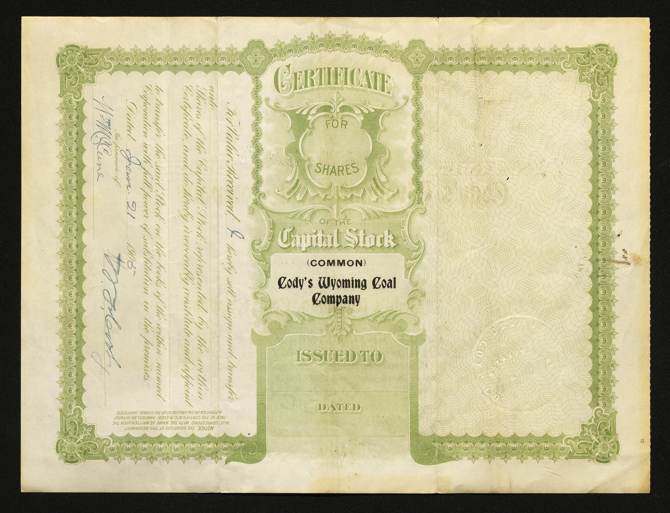 Cody’s Wyoming Coal Company This is a stock certificate for 25 shares of Cody’s Wyoming Coal Company valued at $100 each. In the upper-middle part of the certificate is a vignette of an eagle perching on a stone in the foreground with a train and building to the left in the background and a coal mine to the right in the background. This certificate is bordered by and written in black ink, excluding all handwritten and stamped-in parts. On the bottom left of the certificate is a seal which is partially illegible, where the readable part states “Mine Coal Co.” Cody’s Wyoming Coal Company reads: No. 185 | Shares 25 | $100 each Authorized Capital, $990,000 of which Preferred Stock, $250,000 Common Stock, $740,000 This Certifies That St F Lordy is the owner of Twenty five shares of the Common Capital Stock of Cody’s Wyoming Coal Company. Full paid and non-assessable, transferable only on the books of the Corporation by the holder hereof in person or by Attorney, upon surrender of this Certificate properly endorsed. In Witness whereof, this Corporation has caused this Certificate to be signed by its President and Treasurer, and to be sealed with its corporate seal this 17th day of Dec. A.D. 1904 This certificate signed by the Treasurer John S. Bell And is also signed by the President W. F. Cody On the back of this certificate, printed in a light green ink, is a central information panel with two spaces on either side. The Central Panel reads: Certificate For _____ Shares of the Capital Stock (Common) Cody’s Wyoming Coal Company issued to ________ Dated ______ The Left Panel reads: For Value Received, I hereby sell, assign and transfer unto _________ shares of the Capital Stock represented by the within Certificate, and do hereby irrevocably constitute and appoint ________ to transfer the said Stock on the books of the within named Corporation with full power of substitution in the premises. Dated Jan.21 1905 In presence of Illegible Signed W. F. Cody Notice. The signature of this assignment must correspond with the name as written upon the face of the certificate in every particular, without alteration or enlargement or any change whatever The Right Panel is blank.