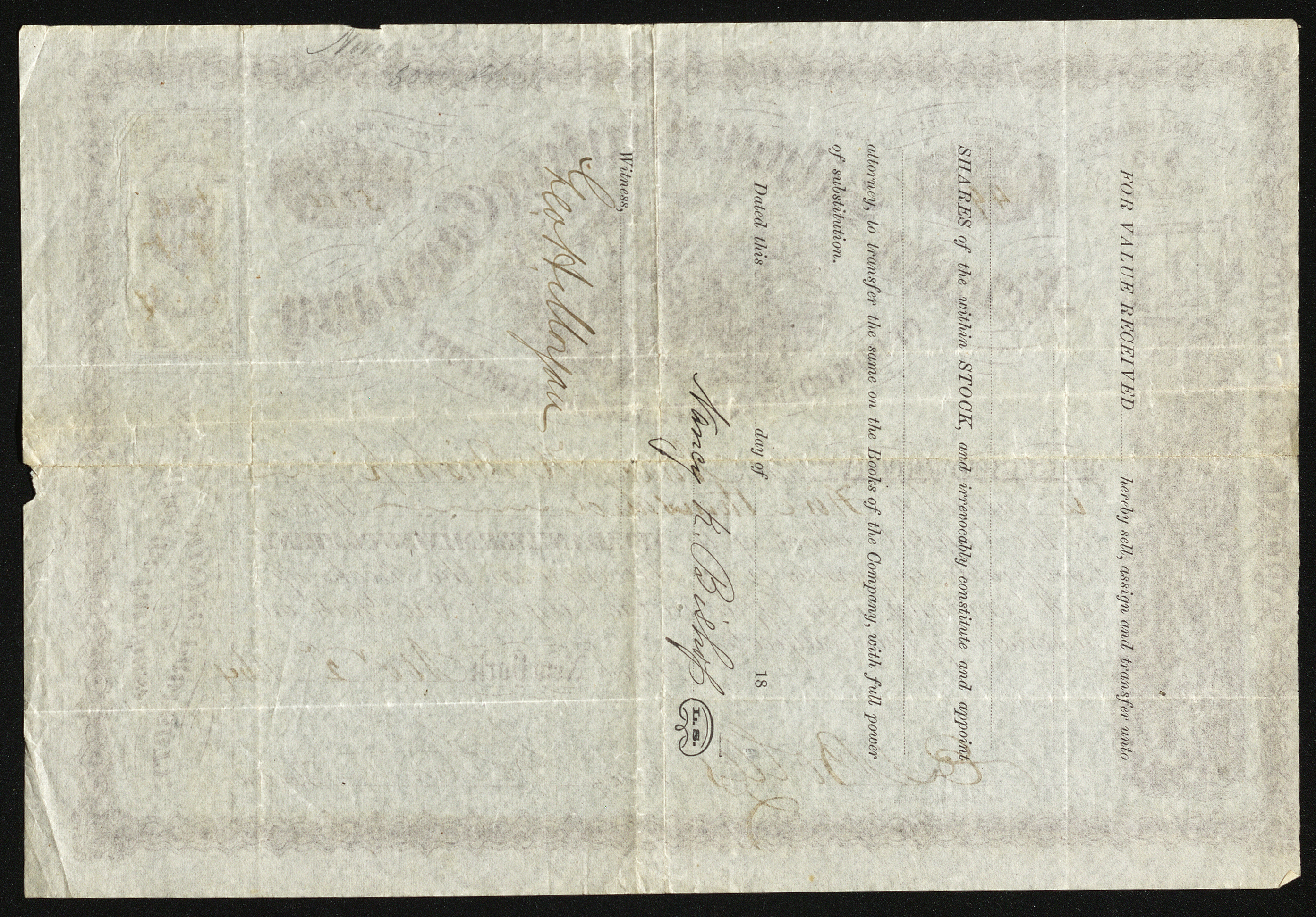 The Nevada Silver Mining Company stock certificate reads: Organized Under the Laws of the State of New York 120,000 Shares | $10 Each | Capital $1,200,000. Number 49 | Shares 5000 Issued for the Purchase of Mining Property Nevada Silver Mining Company Of Humboldt County, Nevada Territory This is to Certify that Nancy K. Bishop is entitled to Five thousand Shares in the Capital Stock of the Nevada Silver Mining Company, transferable in person or by Attorney on the Books of said Company at is Office in the City of New York on surrender of this Certificate Dated New York Nov 2nd 1806 Signed by the Secretary E. L. Bolles Signed by the President Geo Stevenson The back of this stock certificate reads: For Value Received ___ hereby sell, assign and transfer unto _____ Shares of the within Stock, and irrevocably constitute and appoint _____ attorney, to transfer the same on the Books of the Company, with full power of substitution. Dated this ___ day of ____ 18__ Signed by Nancy K. Bishop L.S. Witness George Helloyau