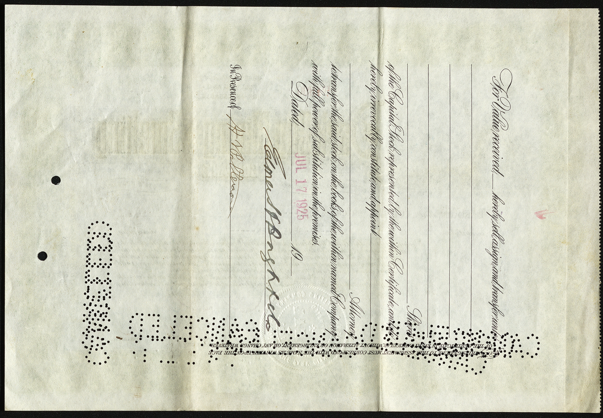 This certificate also has the word “cancelled” hole-punched into to it several times across its bottom. The Park City Mining and Smelting Company stock certificate reads: Certificate for Less than 100 Shares Number F1396 | Shares $5 each. Full Paid and Non-assessable | Shares 17 The Park City Mining and Smelting Company. Incorporated under the Laws of the State of Colorado Countersigned at Boston by an American Trust Company Transfer Agent and Assistant Secretary (illegible) Registered July 17 1925 at The First National Bank of Boston Signed by the registrar (illegible) This is to Certify that Elmer H. Bright & Co. is entitled to seventeen shares in the capital stock of The Park City Mining and Smelting Company, transferrable only on the books of this Company by the holder hereof, in person, or by attorney upon surrender of this certificate properly endorsed. This certificate subject to all the terms, conditions and limitations of the Certificate Incorporation and the By Laws of the Corporation. This certificate is not valid until countersigned by the Transfer Agent and registered by the Registrar. In Witness Whereof, the said Company has caused its corporate seal to be hereto affixed and this certificate to be signed by its President and by its Treasurer, or Secretary this July 16 1925. Signed by Secretary D. C. Murphy Signed by President G. W. Lambourne The back side of this certificate states: For Value received, ____ hereby sell, assign, and transfer unto _______ Shares of the Capital Stock represented by the within certificate, and do hereby irrevocably constitute and appoint ______ Attorney to transfer the said stock on the books of the within named Company with full power of substitution in the premises. Dated, July 17 1925 Signed by (illegible) In Presence of A Patterson