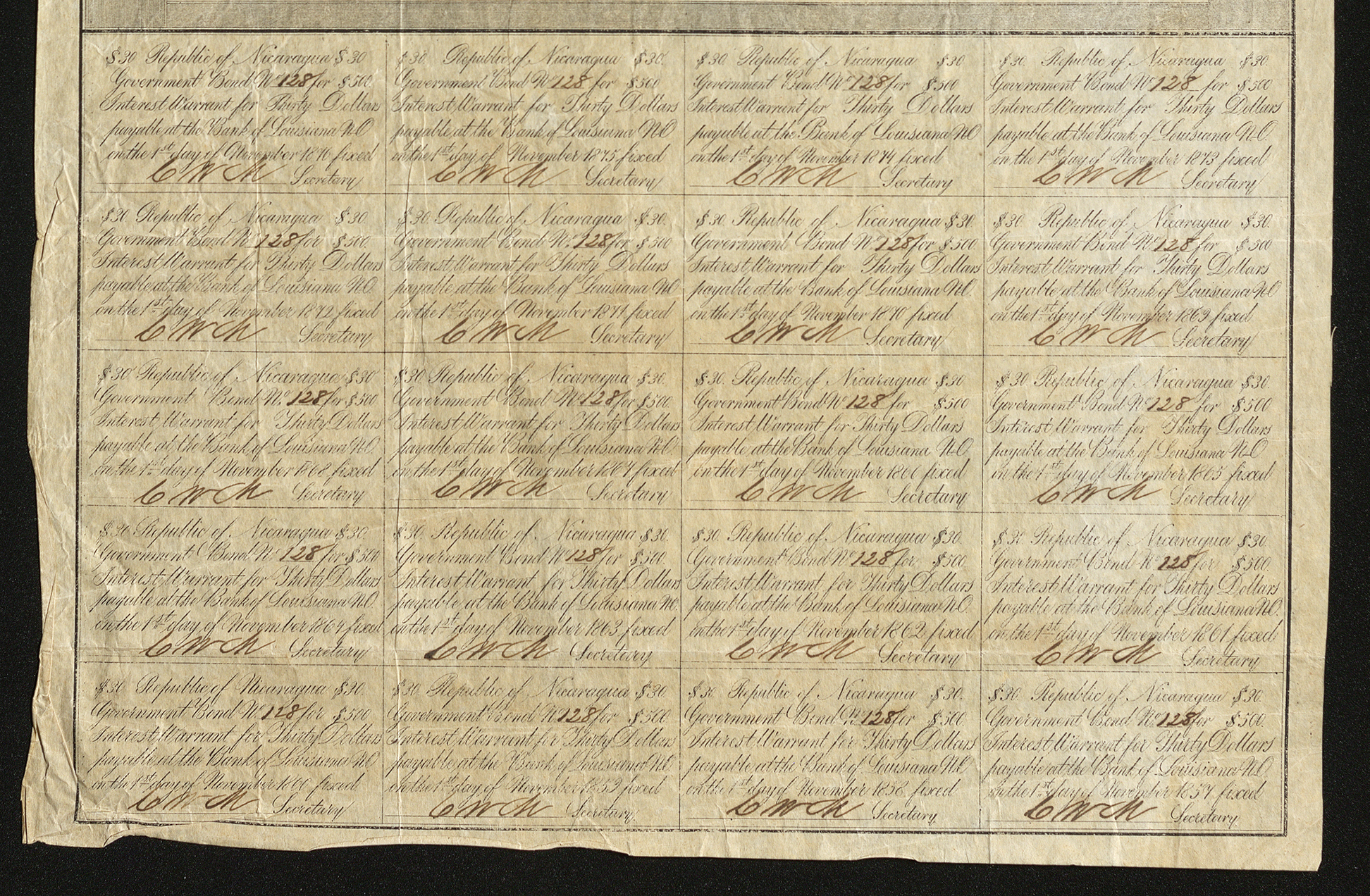 Know all men by these Presents, that the Republic of Nicaragua is indebted to the Bearer hereof in the sum of Five Hundred Dollars, for value received, which that said Republic promises to pay at the Bank of Louisiana in the City of New Orleans in Gold or Silver Coin, or their equivalent in other currencies in twenty years from the date hereof and also to pay an Interest thereon at the rate of Six per centum per annum, payable at the Bank aforesaid, at the end of each and every year upon delivery of the Warrants in the margin hereof.