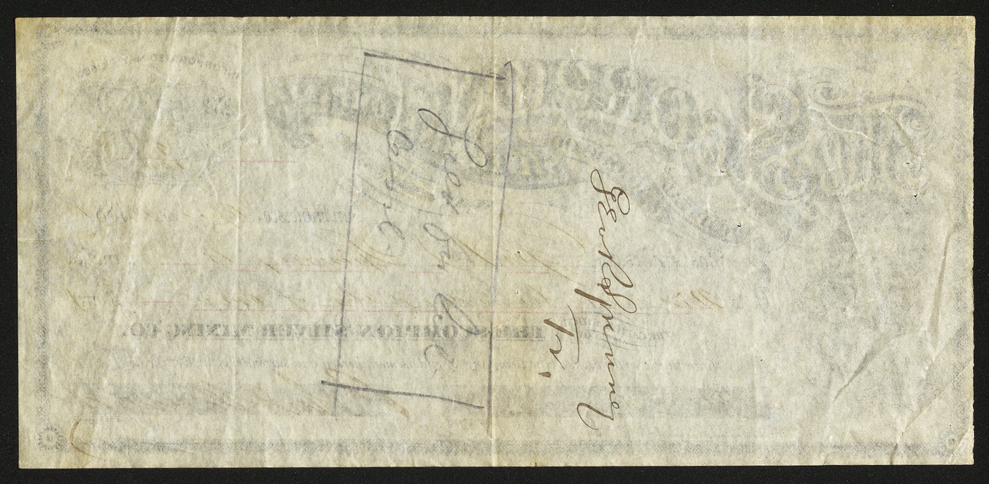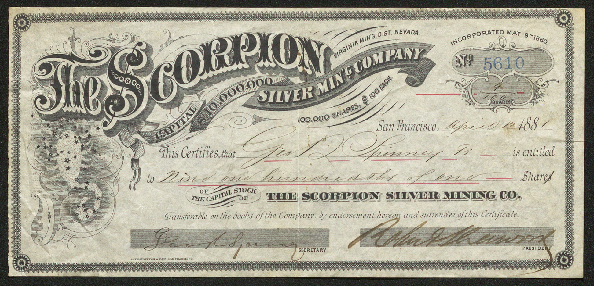 The Scorpion Silver Mining Company stock certificate reads: The Scorpion Silver Mining Company Virginia Mining Dist. Nevada Incorporated May 9th 1860 Capital $10,000,000 | 100,000 Shares, $100 Each No. 5610 | 9100Shares San Francisco April 12 1881 This Certifies, that Geo. R. Spinney, Tr. is entitled to Nine one hundredths of one Share of the Capital Stock of The Scorpion Silver Mining Company. Transferable on the books of the Company, by endorsement hereon and surrender of this Certificate. Signed by the Secretary Geo. R. Spinney Signed by the President Robert Sherwood The back of this document has the signature of Geo. R. Spinney, Tr., as well as an (illegible) statement, written in pencil.