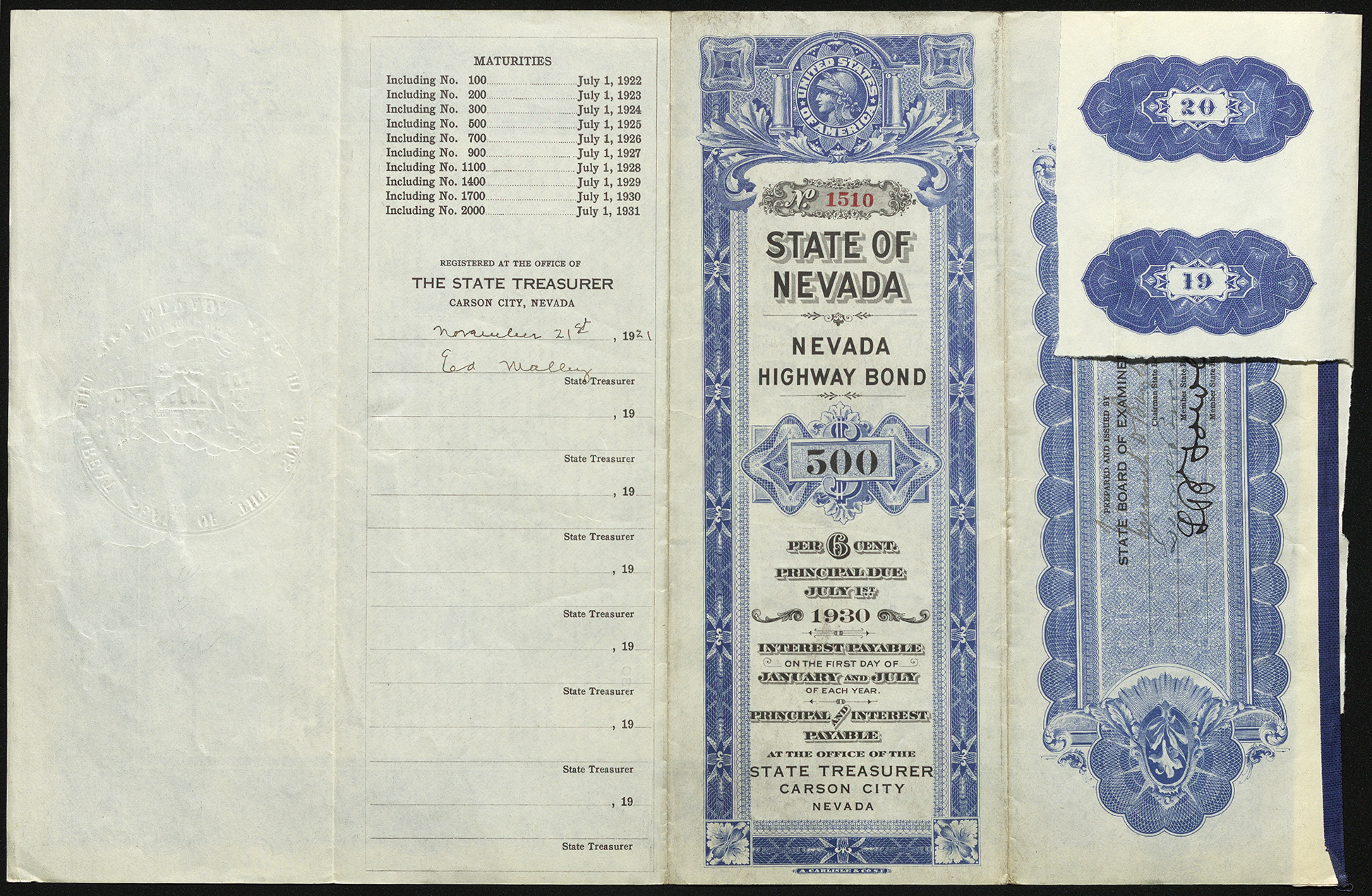 The Nevada Highway Bond reads: 1510 United States of America State of Nevada Nevada Highway Bond $500 Bond of the State of Nevada The State of Nevada, in accordance with the provisions of an Acts entitled “An Act authorizing the Board of Examiners to issue and sell bonds to provide money to pay a portion of the costs of constructing a state highway system, and providing for the payment of said bonds,” approved March 28, 1919, for value received, hereby promises to pay, as the office of the State Treasurer, Carson City, Nevada, so bearer, on the first day of July, A.D. 1930, the sum of Five Hundred Dollars, in gold coin of the United States, with interest thereon, in like gold coin, at the rate of six per centum per annum, payable semi-annually, on the first day of January and the first day of July of each year, upon surrender of the annexed coupons as they severally become due, during the life of this bond. It is hereby certified and warranted that the Board of Examiners issuing this bond is created by and under the Constitution of the State of Nevada, and has been authorized by the Act entitled and approved as aforesaid to issue this bond, which has been duly issued, advertised, and sold by said Board of Examiners, as duly requested by the Board of Directors of the Department of Highways, and for the purposes designated in, and in all respects pursuant to, the Acts entitled and approved as aforesaid, and that all condititions precedent rendering this bond valid and binding have been fully and strictly complied with and performed; and also that the total indebtedness of the State of Nevada, including this bond, does not exceed any Constitutional or statutory limitation, and that due provision has been made for the levy of a direct annual ad valorem tax on all taxable property of the State of Nevada, in addition to all other taxes, sufficient to pay interest accruing hereunder as the same falls due, and to discharge the principal hereof at maturity; and lastly, that the faith of The State of Nevada is hereby pledged that the Acts entitled and approved as aforesaid shall not be repealed, or the taxation thereby imposed be omitted, until this bond, and coupons issued under and by virtue thereof, shall have been paid in full, as in said Act provided. In Testimony Whereof, The Governor, the State Treasurer, and the State Controller have, respectively, signed, endorsed, and countersigned these presents, and have caused the same to be authenticated by the Great Seal of the State, at Carson City, this seventeenth day of September, A.D. one thousand nine hundred and twenty-one. Signed by Governor Fred Balzar Signed by State Treasurer Ed Malley Countersigned by State Controller G— The back of this bond is split into four columns. The first/leftmost column is blank The second column states: Maturities Including No. 100……………………..July 1, 1922 Including No. 200……………………..July 1, 1923 Including No. 300……………………..July 1, 1924 Including No. 500……………………..July 1, 1925 Including No. 700……………………..July 1, 1926 Including No. 900……………………..July 1, 1927 Including No. 1100……………………..July 1, 1928 Including No. 1400……………………..July 1, 1929 Including No. 1700……………………..July 1, 1930 Including No. 2000……………………..July 1, 1931 Registered at the Office of the State Treasurer Carson City, Nevada November 21st, 1921 Signed by State Treasurer Ed Malley ______,19__ Signed by _______ ______,19__ Signed by _______ ______,19__ Signed by _______ ______,19__ Signed by _______ ______,19__ Signed by _______ ______,19__ Signed by _______ The third column states: United States of America No. 1510 State of Nevada Nevada Highway Bond $500 Per 6 Cent. Principal Due July 1st 1930 Interest Payable on the first day of January and July of each Year Principal and Interest payable at the Office of the State Treasurer, Carson City, Nevada The fourth column reads: Prepared and issued by the Board of Examiners Signed by Chairman illegible Signed by Member State Bo— cannot be seen from picture Signed by Member State Bo— cannot be seen from picture Also included with this bond are at least 20 of the aforementioned coupons; 1 - 18 have been surrendered to the state treasurer or whomever, 19 and 20 are still present. The Nevada Highway Bond reads: 1510 United States of America State of Nevada Nevada Highway Bond $500 Bond of the State of Nevada The State of Nevada, in accordance with the provisions of an Acts entitled “An Act authorizing the Board of Examiners to issue and sell bonds to provide money to pay a portion of the costs of constructing a state highway system, and providing for the payment of said bonds,” approved March 28, 1919, for value received, hereby promises to pay, as the office of the State Treasurer, Carson City, Nevada, so bearer, on the first day of July, A.D. 1930, the sum of Five Hundred Dollars, in gold coin of the United States, with interest thereon, in like gold coin, at the rate of six per centum per annum, payable semi-annually, on the first day of January and the first day of July of each year, upon surrender of the annexed coupons as they severally become due, during the life of this bond. It is hereby certified and warranted that the Board of Examiners issuing this bond is created by and under the Constitution of the State of Nevada, and has been authorized by the Act entitled and approved as aforesaid to issue this bond, which has been duly issued, advertised, and sold by said Board of Examiners, as duly requested by the Board of Directors of the Department of Highways, and for the purposes designated in, and in all respects pursuant to, the Acts entitled and approved as aforesaid, and that all condititions precedent rendering this bond valid and binding have been fully and strictly complied with and performed; and also that the total indebtedness of the