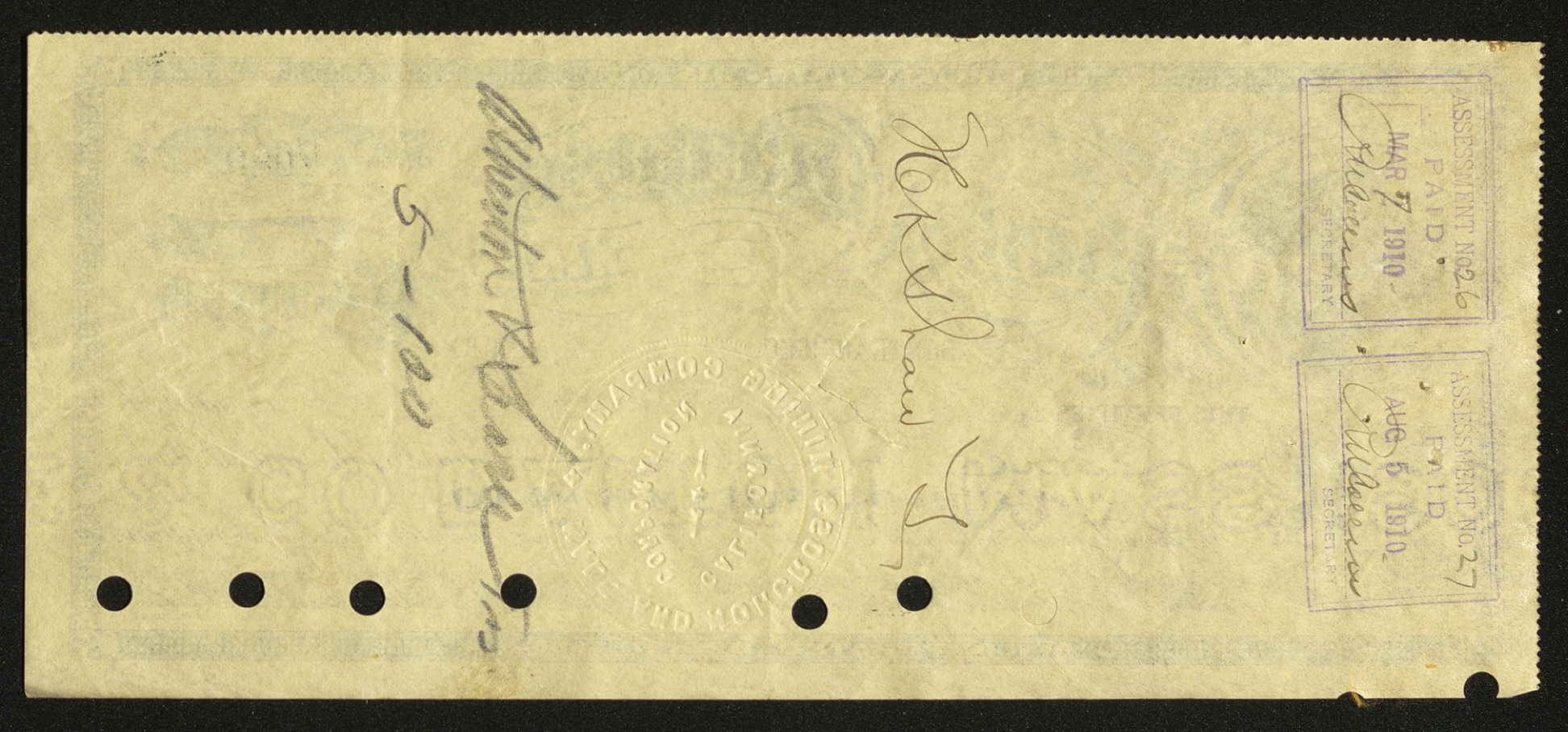 Back of certificate shows legal language, signatures, punched out holes, and stamps