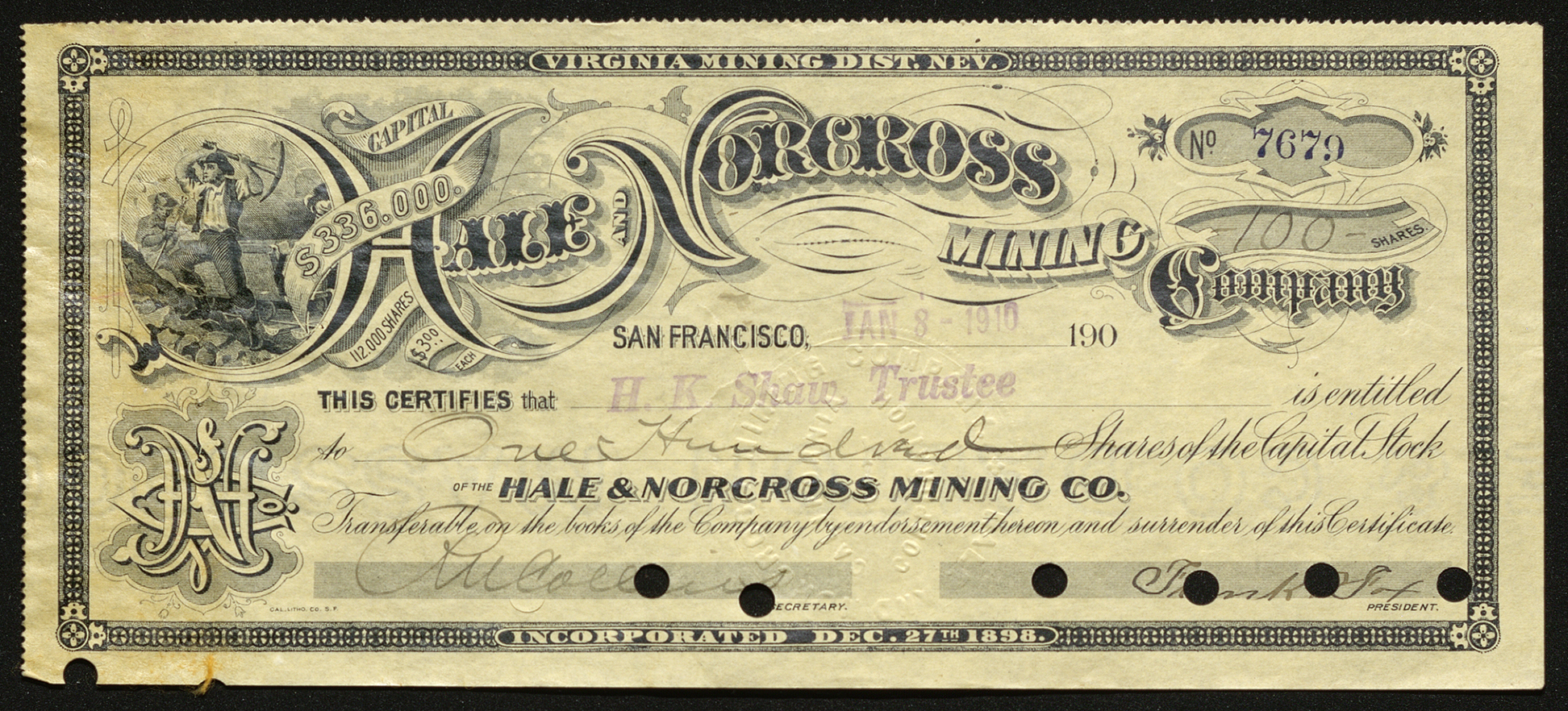 This stock certificate (No. 7679) represents 100 shares valued at $3.00 each for the Hale and Norcross Mining Company. The company owned mines part of the Comstock Lode. It was also involved in the renowned “Hale and Norcross Mining Company Suit" where millions were claimed to be stolen by investors.