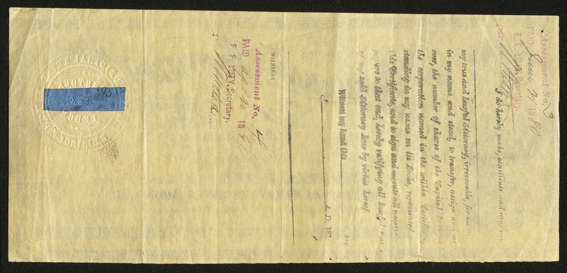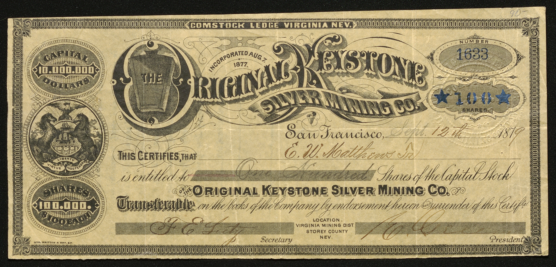 The Original Keystone Silver Mining Company stock certificate reads: Comstock Ledge, Virginia Nev. Location. Virginia Mining Dist., Storey County, Nev. Capital 10,000,000 Dollars | Shares 100,000 | $100 Each Incorporated Aug 7, 1877 Number 1633 | 100 Shares San Francisco, Sept 12th 1879 This Certifies, that E. W. Matthews Jr. is entitled to One Hundred Shares of the Capital Stock of the Original Keystone Silver Mining Co. Transferable on the books of the Company by endorsement hereon and surrender of this Certificate. Signed by the Secretary F. E. Sixty Signed by the President E. Cecri The backside of this document has 2 assessment dividend stamps, as well as a legal body of text stamped on. The Legal text states: I do hereby make, constitute and appoint ____ my true and lawful Attorney, irrevocable, for me and in my name and stead, to transfer, assign, and set over, the number of shares of the Capital Stock of the corporation named in the within Certificate, standing in my name on the Books, represented by this Certificate, and to sign and execute all necessary papers to that end, hereby ratifying all lawful acts of my said Attorney done by virtue hereof. Witness my hand this ____ day of ____ A.D. 187_ Witness ____ Assessment No. 3 Paid June 7, 1880 F. E. Luty, Secretary. Per (illegible) Assessment No. 4 Paid April, 1881 F. E. Luty, Secretary. Per (illegible)