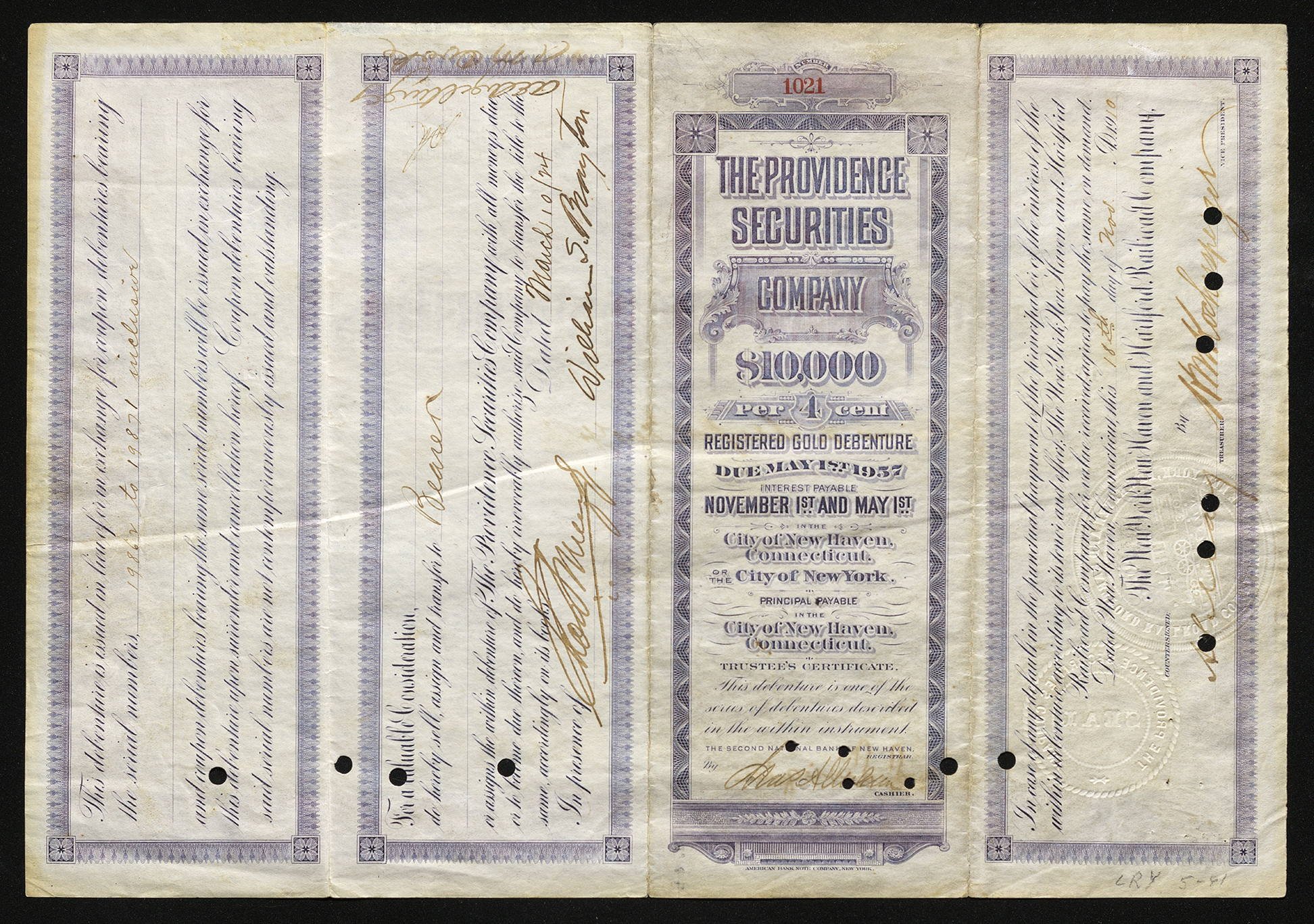 Number 1021. The Providence Securities Company. $10,000 per 4 cent. REGISTERED GOLD DEBENTURE. DUE MAY 1ST IN THE CITY OF NEW HAVEN, CONNECTICUT. OR THE CITY OF NEW YORK. Principal payable in the City of New Haven, Connecticut. Trustees certificate. This debenture is one of the series of debentures described in the within instrument the Second National Bank of New Haven.