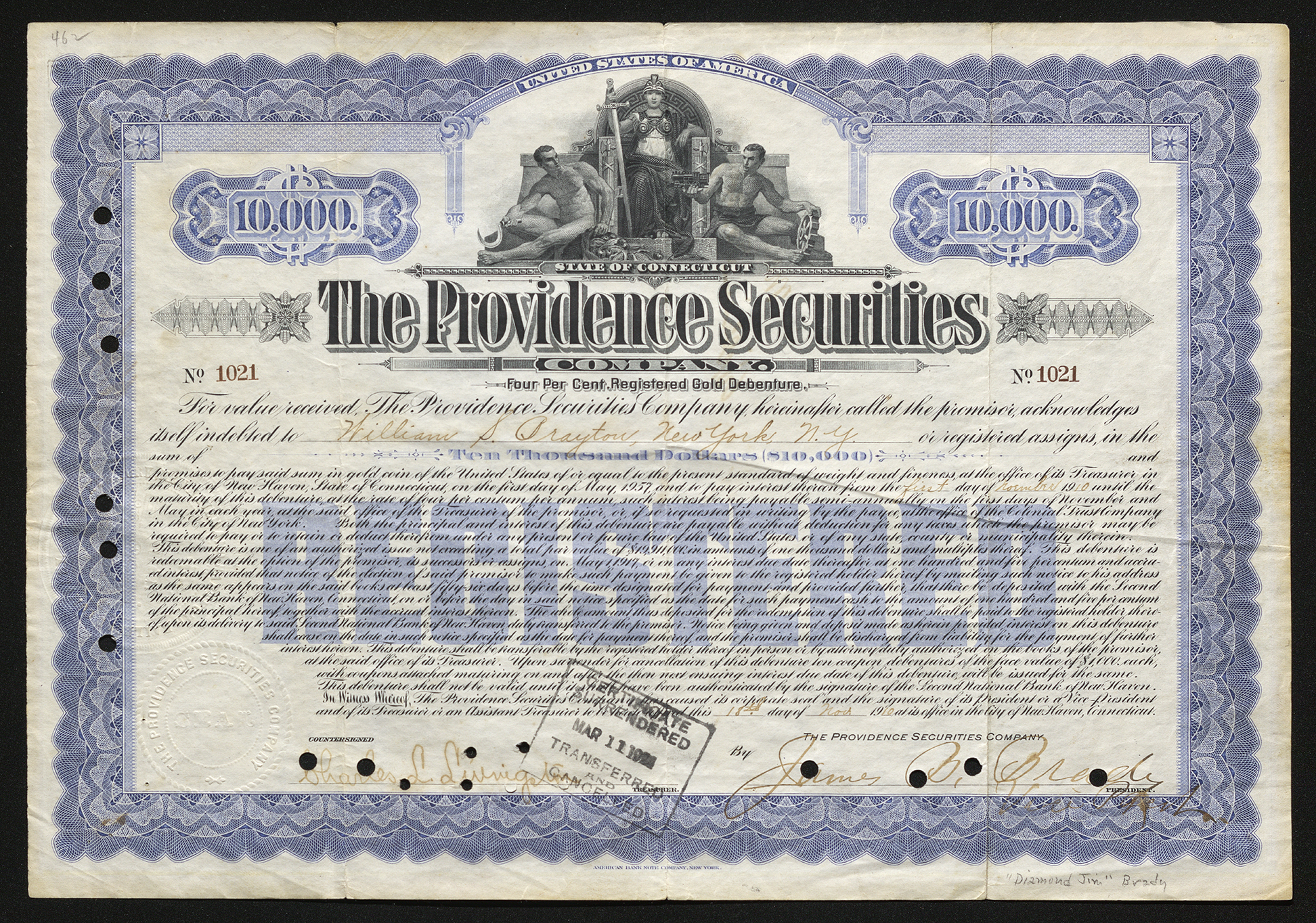 This stock certificate (No. 1021) represents the amount of $10,000 for The Providence Securities Company. It is one of the most high-valued bonds in the collection.