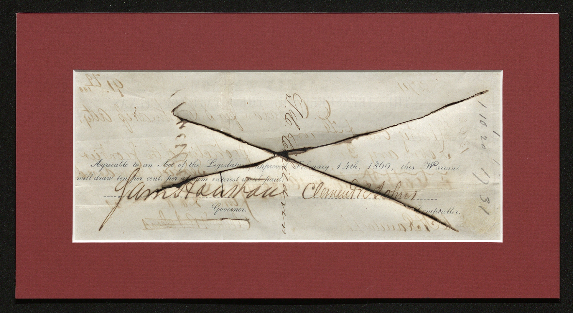 Backside shows signatures and an X crossing the document where ink bled through and cut the paper