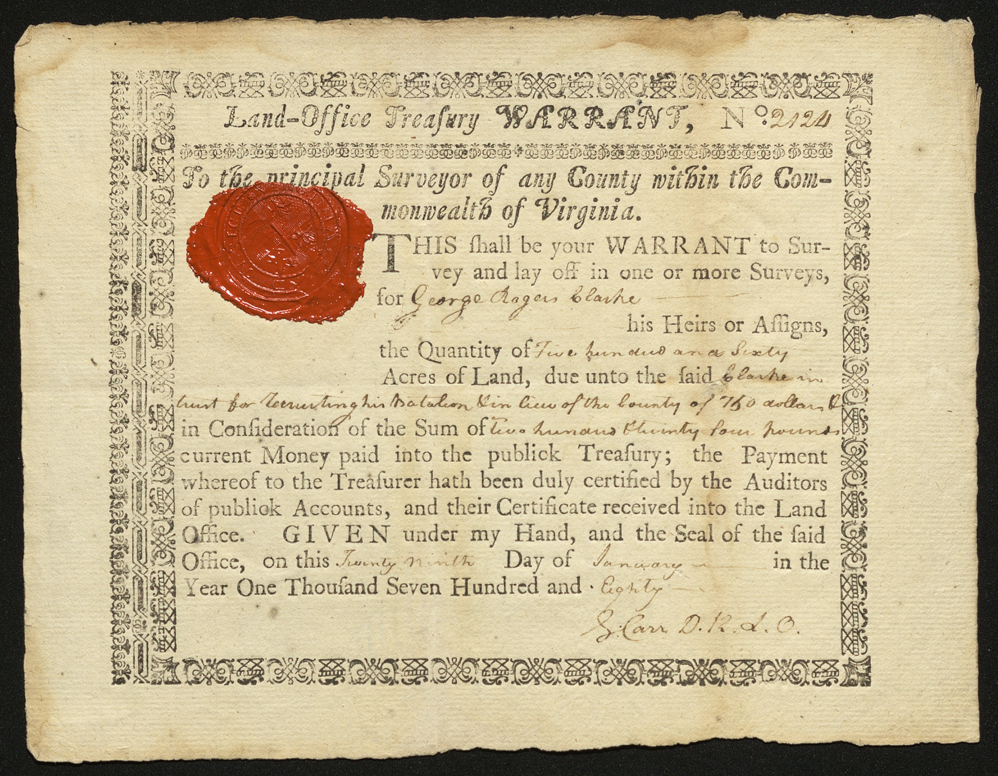 The Land-Office Treasury Warrant Reads: Land-Office Treasury WARRANT, No. 2124 To the principal Surveyor of any County within the Commonwealth of Virginia. This shall be your WARRANT to Survey and lay off in one or more Surveys for George Rogers Clarke his Heirs or assigns, the Quantity of Five hundred and Sixty Acres of Land, due to the said Clarke in hunt for Recruiting his Batalion Sin him of the bounty of 750 (illegible) in Confideration of the Sum of Two hundred *illegible* four pounds current Money paid into the publick Treasury; the Payment whereof to the Treasurer hath been duly certified by the Auditors of publick Accounts, and their Certificate received into the Land Office. GIVEN under my Hand, and the Seal of the said Office, on this Twenty Ninth Day of January in the Year One Thousand Seven Hundred and Eighty Signed by S. Carr D. R. d. O The back side of this document is blank.