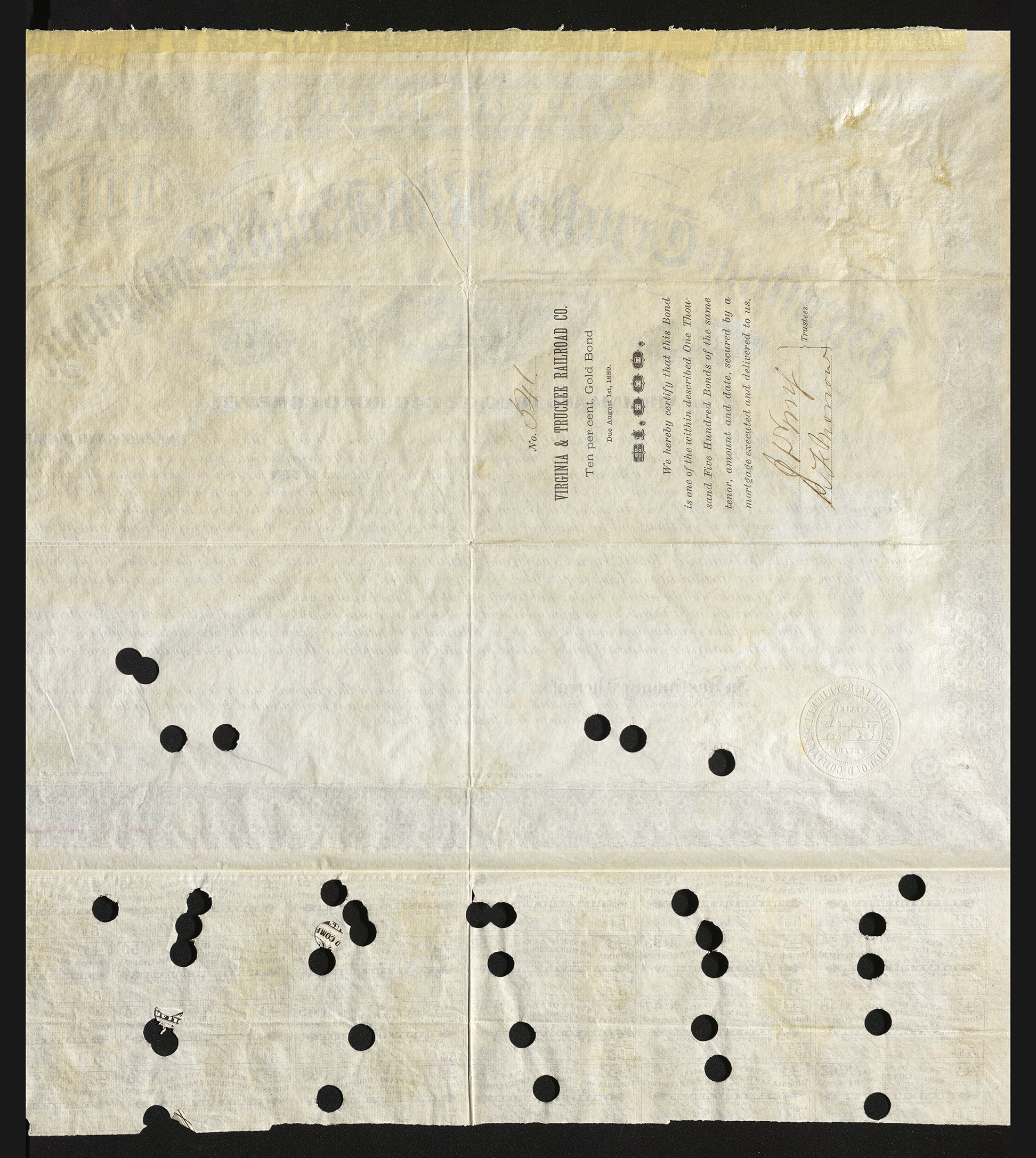 This bond certificate (No. 541) represents $1,000 for the Virginia & Truckee Railroad Company. This railroad line, which in-part still exists today, originally transported ore from the Comstock Lode between Virginia City, Nevada and Truckee, California, running through Reno, Nevada. This bond is signed by Company President William Sharon, a notable Nevada businessman who went on to be a state senator from 1875-1881.